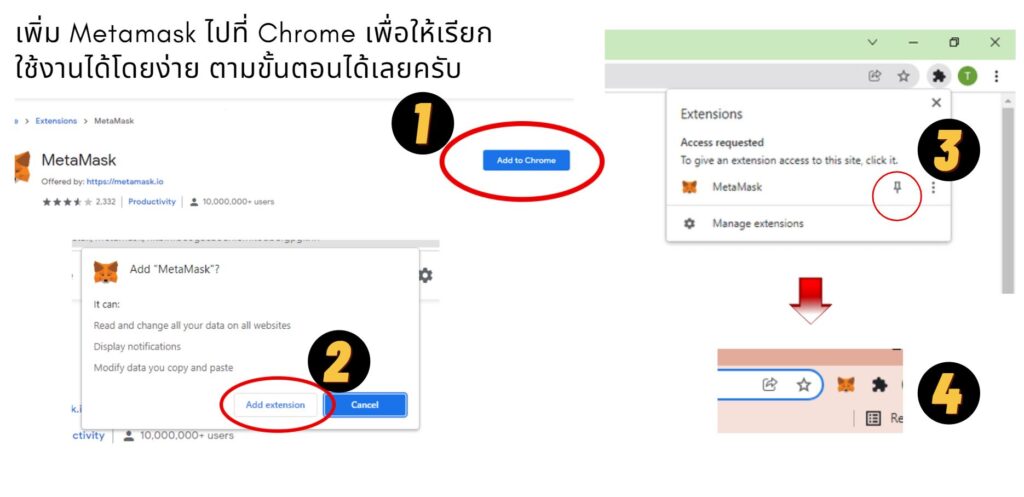 3. เพิ่ม Metamask ไปที่ Chrome เพื่อให้เรียกใช้งานได้โดยง่าย ตามขั้นตอนได้เลยครับ