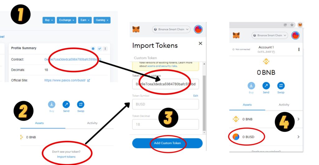 3. นำข้อมูลที่ได้กลับมากรอกใน Metamask โดยการกด Import Tokens และใส่ข้อมูลที่เราไปหามาตามภาพด้านล่าง